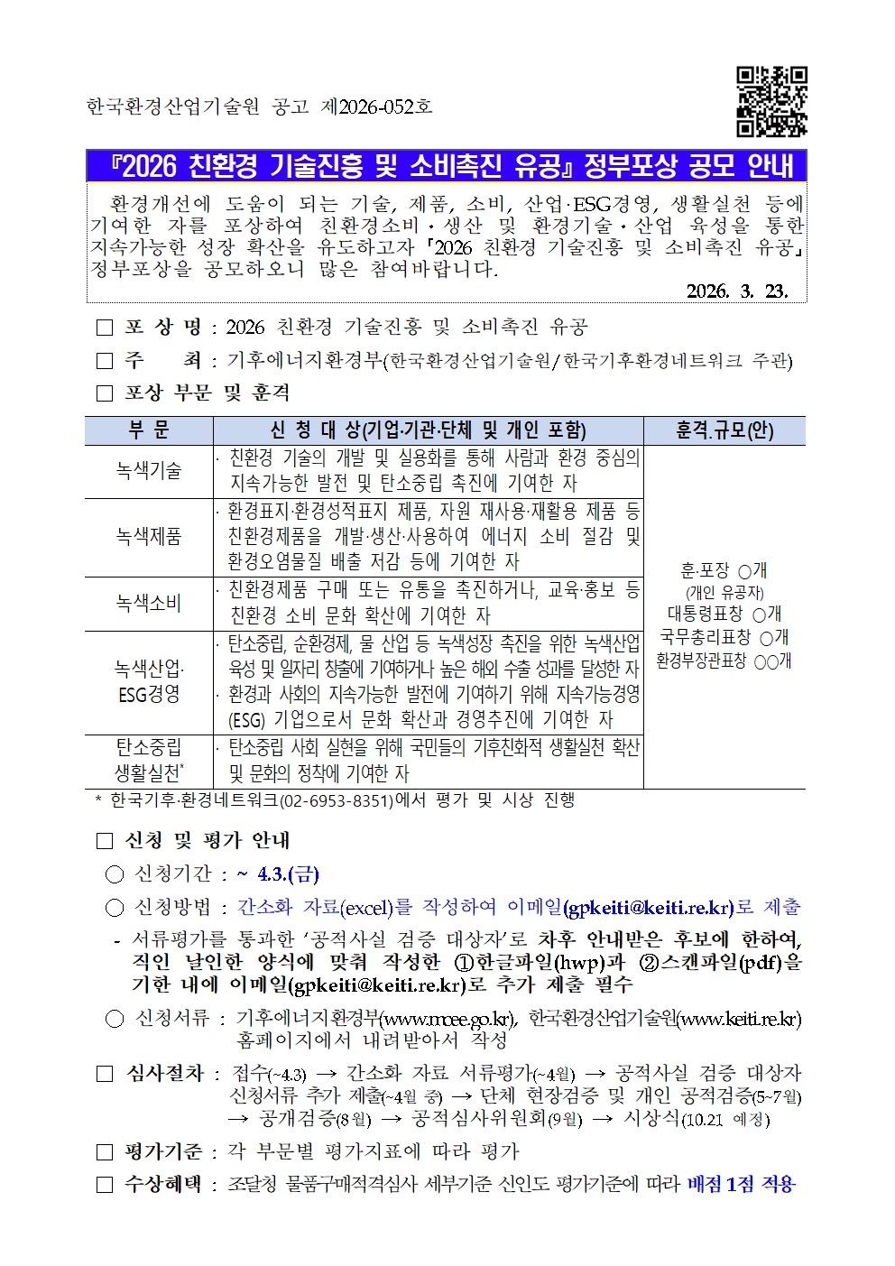 2026 친환경 기술진흥 및 소비촉진 유공 정부포상 공고 연장 안내(~4.3)