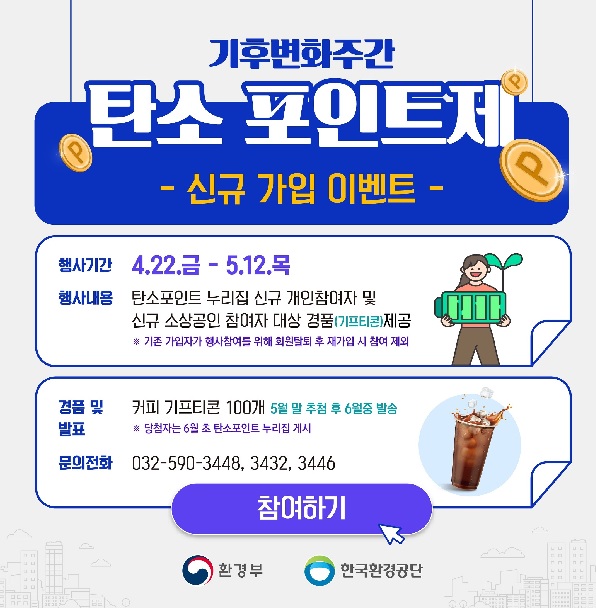 이벤트 기간 내에 신규로 탄소포인트제 가입하신 분들 중 100명을 추첨하여 커피기프티콘을 증정해드립니다.