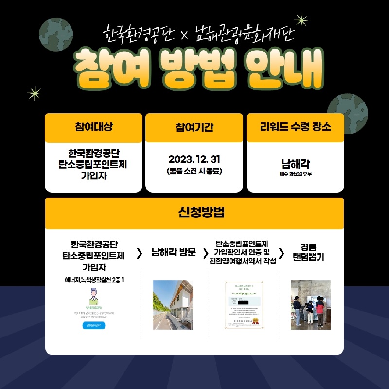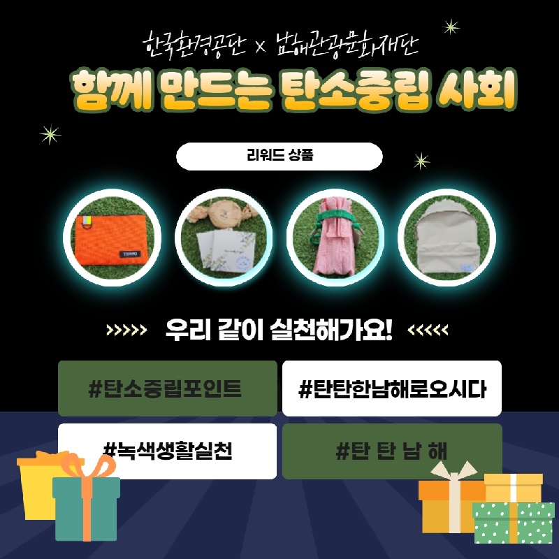 2023. 11. 15일 ~ 12. 31일 까지 남해관광문화재단과 탄소중립 실천을 위한 관광 이벤트를 시행합니다.